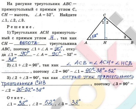 На рисунке треугольник АВС - прямоугольный с прямым углом С, СН - высота, А = 52. Найдите 1, 2, 3
