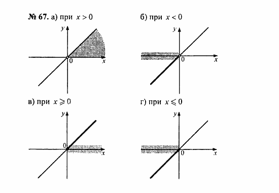 Определите с помощью графика функции у = х, при каких значениях x выполняется неравенство: а) y >0; б) у ≥ 0; в) у < 0; г) у ≤ 0.