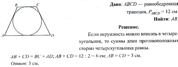Около окружности описана равнобедренная трапеция, периметр которой равен 12 см. Вычислите длину боковой стороны трапеции.