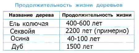 Интересно, что некоторые растения живут очень долго, особенно деревья. В дополнительной литературе, Интернете найдите сведения о продолжительности жизни деревьев. Заполните таблицу.