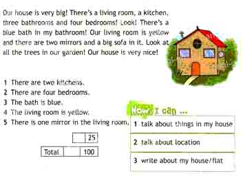 Наш дом очень большой! В нем гостиная, кухня, три ванных комнаты и четыре спальни! Посмотри! Синяя ванна в моей ванной комнате! Наша гостиная желтая и в ней два зеркала и большая софа. Посмотри на деревья в нашем саду. Наш дом очень милый!