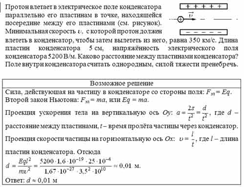 Протон влетает в электрическое поле конденсатора параллельно его пластинам в точке, находящейся посередине между его пластинами (см. рисунок). Минимальная скорость v, с которой протон должен влететь в конденсатор, чтобы затем вылететь из него, равна 350 км/с. Длина пластин конденсатора 5 см, напряжённость электрического поля конденсатора 5200 В/м. Каково расстояние между пластинами конденсатора? Поле внутри конденсатора считать однородным, силой тяжести пренебречь.