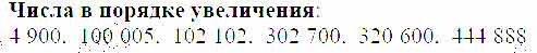 Запишите числа в порядке увеличения. 320 600, 302 700, 4 900, 100 005, 444 888, 102 102