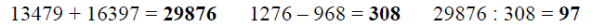 Составьте   выражение   из  суммы   чисел   13 479   и   16 397,   знака ; деления и   разности   чисел   1 276   и   968.   Найдите  его  значение.
