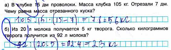а) В клубке 15 дм проволоки. Масса клубка 105 кг. Отрезали 7 дм. Чему равна масса отрезанного куска?