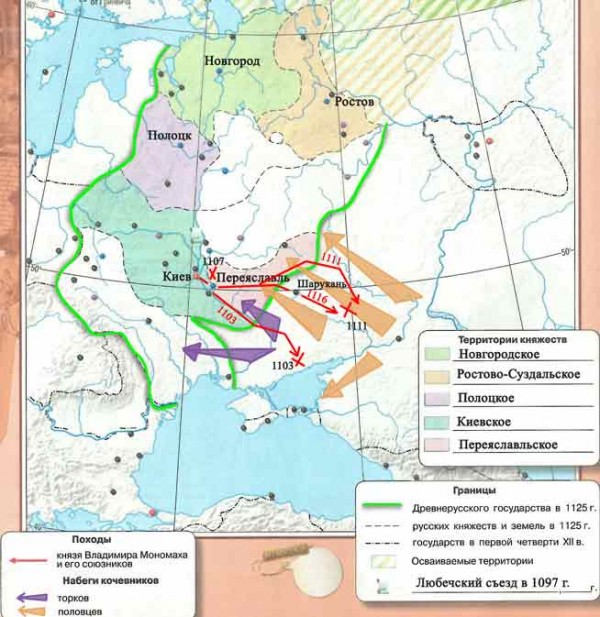Отметьте наиболее крупные походы князя Владимира Мономаха против половцев. Обозначьте места и годы сражений и подпишите название города, захваченного русским войском в ходе этих походов.