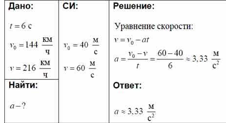 С каким ускорением движется гоночный автомобиль, если его скорость за 6 с увеличивается со 144 до 216 км/ч?