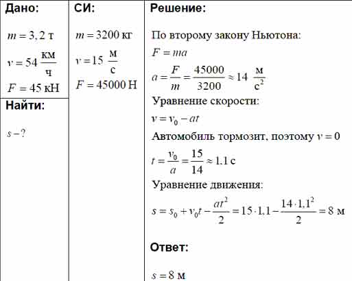 Автомобиль массой 3,2 т движется по горизонтальному пути со скоростью 54 км/ч. На каком расстоянии автомобиль остановится, если при торможении сила трения равна 45 кН