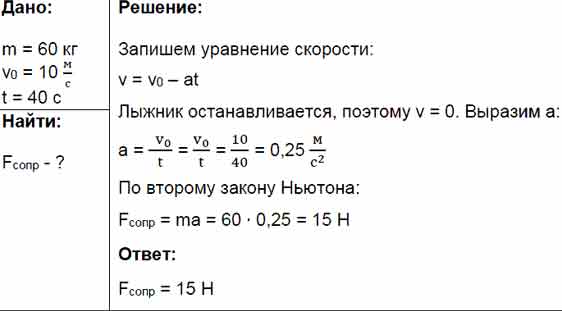 Лыжник массой 60 кг, имеющий в конце спуска скорость 10 м/с, останавливается через 40 с после окончания спуска. Определите силу сопротивления его движению.