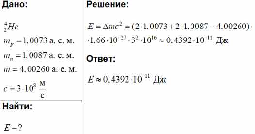 Рассчитайте энергию связи ядра атома гелия 4 2 Не. Масса протона 1,0073 а. е. м., масса нейтрона 1,0087 а. е. м., масса изотопа гелия 4,00260 а. е. м