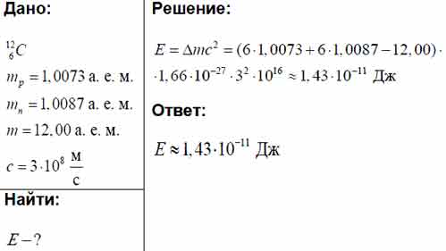 Рассчитайте энергию связи ядра изотопа углерода 12 6С. Масса протона 1,0073 а. е. м., масса нейтрона 1,0087 а. е. м., масса изотопа углерода 12,00 а. е. м.
