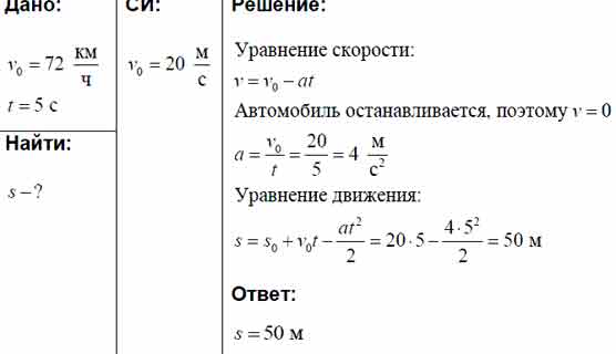 Определите тормозной путь автомобиля, если при аварийном торможении, двигаясь со скоростью 72 км/ч, он остановился через 5 с.