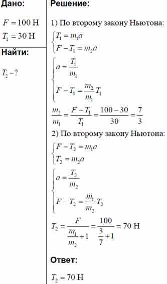 Два груза, соединенных нитью, движутся по гладкой поверхности. Когда сила 100 Н была приложена к правому грузу, сила натяжения нити была равна 30 Н. Какой будет сила натяжения нити, если эту силу приложить к левому грузу?