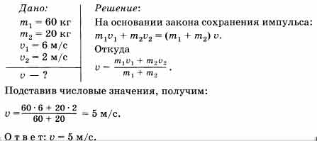 Человек массой 60 кг бежит со скоростью 6 м/с, догоняет тележку массой 20 кг и вскакивает на нее. Скорость тележки 2 м/с. С какой скоростью станет двигаться тележка?