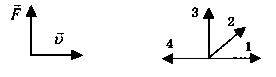 На левом рисунке представлены вектор скорости и вектор силы, действующей на тело. Какой из четырёх векторов на правом рисунке указывает направление вектора ускорения этого тела?