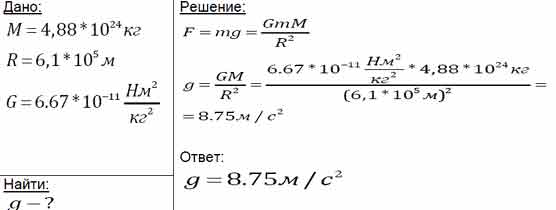 Определите ускорение свободного падения на поверхности Венеры, если её масса 4,88 • 10^24 кг, а радиус 6,1 • 10^6 м.