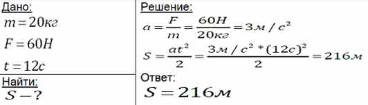 К неподвижному телу массой 20 кг приложили постоянную силу 60 Н. Какой путь пройдёт это тело за 12 с?