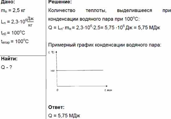 Какое количество теплоты выделится при конденсации стоградусного водяного пара, если масса пара 2,5 кг? Изобразите процессы графически.