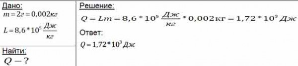 Какое количество теплоты потребуется для обращения в пар спирта массой 2 г, нагретого до температуры кипения? Удельная теплота парообразования спирта 8,6 • 10^5 Дж/кг.