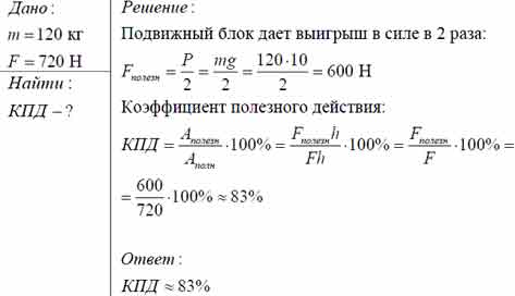 Бадью с известковым раствором массой 120 кг поднимают на второй этаж строящегося дома при помощи подвижного блока. На веревку во время подъема действуют с силой 720 Н. Определите КПД установки.