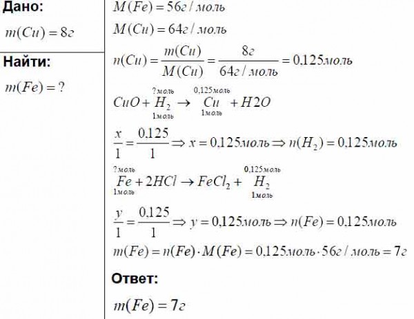 Вычислите массу железа, которое следует растворить в соляной кислоте, чтобы полученным водородом можно было восстановить 8 г меди из оксида меди(II).