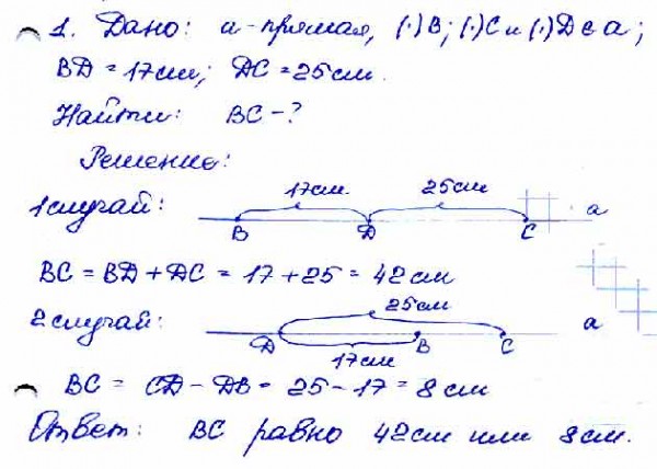Три точки В, С и D лежат на одной прямой. Известно, что BD = 17 см, DC = 25 см. Чему может быть равна длина отрезка ВС?