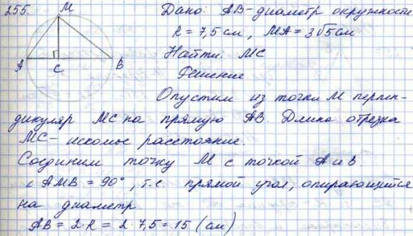 Отрезок АВ — диаметр окружности, радиус которой равен 7,5 см. Точка М окружности удалена от точки А на 5V5 см. Найдите расстояние от точки М до прямой АВ.