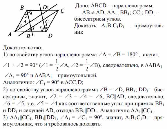 В параллелограмме, смежные стороны которого не равны, проведены биссектрисы углов. Докажите, что при их пересечении образуется прямоугольник.