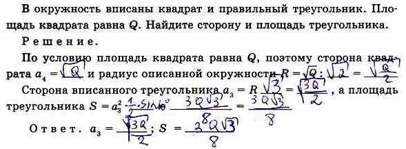 В окружность вписаны квадрат и правильный треугольник. Площадь квадрата равна Q. Найдите сторону и площадь треугольника