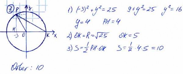 Окружность, заданная уравнением х2 + у2 = 25, пересекает положительную полуось Ох в точке К, точка Р лежит на окружности, её абсцисса равна -3. Найдите площадь треугольника ОКР.