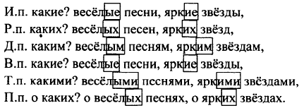 Просклоняй прилагательные вместе с существительными: весёлые песни, яркие звёзды. Выдели окончания прилагательных. Сравни окончания в родительном и предложном падежах. Сделай вывод.