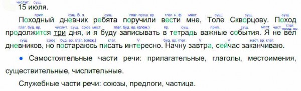 Когда мальчик делал свою запись, он, конечно, не думал о частях речи. Но ты знаешь, что каждое слово относится к какой-то части речи. Определи, какими из них воспользовался автор строк, и надпиши их над словами. Но сначала уточни, как будешь действовать.