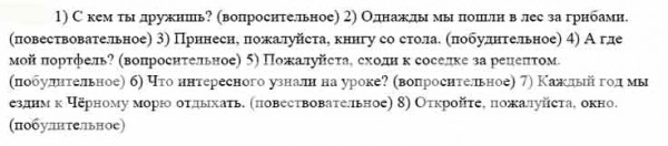 1) С кем ты дружишь? (вопросительное) 2) Однажды мвы пошли в лес за грибами (повествование) 3) Принеси, пожалуйста, книгу со стола. (побудительное) 4) А где мой портфель? (вопросительное) 5) Пожалуйста, сходи к соседке за рецептом. (побудительное) 6) Что интересного узнали на уроке? (вопросительное) 7) Каждый год мы ездим к Чёрному морю отдыхать. (повествовательное) 8) Откройте, пожалуйста, окно. (побудительное)