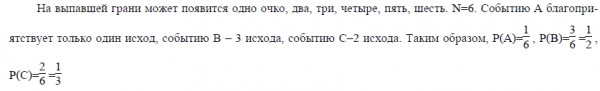 Бросается игральная кость. Чему равны вероятности следующих событий: А - выпадет грань с 6 очками, В - выпадет грань с четным числом очков, С - выпадет грань с числом очков, делящимся на 3 ?