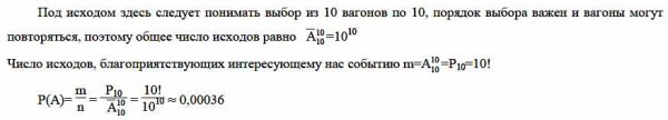 10 студентов условились ехать определенным электропоездом, но не договорились о вагоне. Какова вероятность того, что ни один из них не встретится с другим, если в составе электропоезда 10 вагонов. Предполагается, что все возможные распределения студентов по вагонам равновероятны