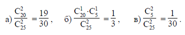 Студент пришел на экзамен, зная 20 из 25 вопросов программы и получил 2 вопроса, наудачу выбранных из 25. Найти вероятность того, что студент: а) знает оба вопроса; б) знает один вопрос из двух предложенных; в) не знает оба эти вопроса.