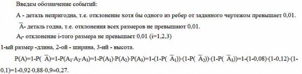 Деталь считается годной, если отклонение размера каждого из ребер от заданного чертежом не превышает 0,01. Вероятности отклонений, превышающих 0,01; составляют по длине - pi=0,08; по ширине р2=0,12; по высоте - рз=0,1. Найти вероятность непригодности детали: