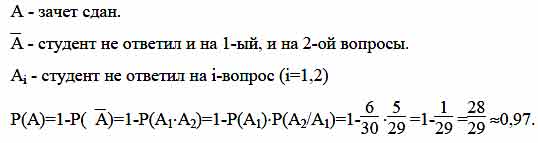 Студент пришел на зачет, зная из 30 вопросов только 24. Какова вероятность сдать зачет, если после отказа отвечать на вопрос преподаватель задает еще только один вопрос?