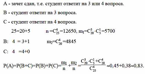 Студент знает 20 из 25 вопросов программы. Зачет считается сданным, если студент ответит не менее, чем на 3 из 4 поставленных в билете вопросов. Какова вероятность того, что студент сдаст зачет?