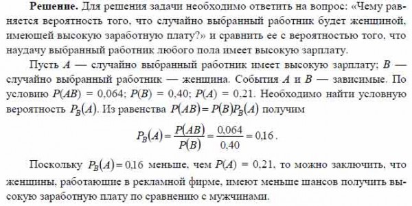 В большой рекламной фирме 21 % работников получают высокую заработную плату. Известно также, что 40 % работников фирмы — женщины, а 6,4 % работников — женщины, получающие высокую заработную плату. Можно ли утверждать, что на фирме существует дискриминация женщин в оплате труда?