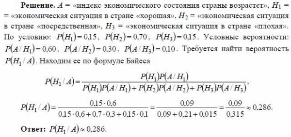 Экономист-аналитик условно подразделяет экономическую ситуацию в стране на «хорошую», «посредственную» и «плохую» и оценивает их вероятности для данного момента времени в 0,15; 0,70 и 0,15 соответственно. Некоторый индекс экономического состояния возрастает с вероятностью 0,60, когда ситуация «хорошая»; с вероятностью 0,30, когда ситуация посредственная, и с вероятностью 0,10, когда ситуация «плохая». Пусть в настоящий момент индекс экономического состояния возрос. Чему равна вероятность того, что экономика страны на подъеме?