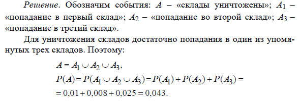 На военных учениях летчик получил задание «уничтожить» 3 рядом расположенных склада боеприпасов противника. На борту самолета одна бомба. Вероятность попадания в первый склад примерно равна 0,01, во второй – 0,008, в третий – 0,025. Любое попадание в результате детонации вызовет взрыв и остальных складов. Какова вероятность того, что склады противника будут уничтожены?