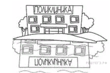 Поликлиника стоит на берегу озера (см. рисунок). Нарисуй, как будет выглядеть отражение вывески в воде.