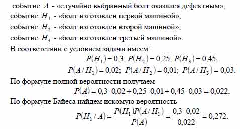 На предприятии, изготовляющем болты, первая машина производит 30%, вторая - 25%, третья – 45% всех изделий. Брак в их продукции составляет соответственно 2%, 1%, 3%. Найдите вероятность того, что случайно выбранный болт, произведенный первой машиной, оказался дефектным