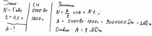 Какую работу совершает двигатель мощностью 5 кВт за 0,5 ч?