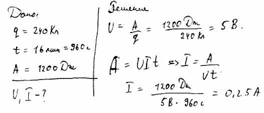 При переносе заряда 240 Кл из одной точки электрической цепи в другую за 16 мин была совершена работа 1200 Дж. Определите напряжение и силу тока в цепи.