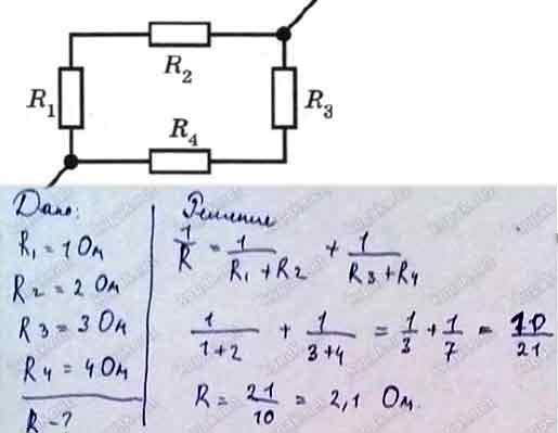 Четыре сопротивления R1 = 1 Ом, R2 = 2 Ом, R3 = 3 Ом, R4 = 4 Ом соединены по схеме, изображенной на рисунке. Определите общее сопротивление цепи.