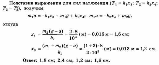 К потолку лифта на двух пружинах, жесткости которых kx = 2 • 103 Н/м и k2 = 103 Н/м, подвешены два тела массами тх = 1 кг и т2 = 2 кг (рис. 35). Лифт движется вверх с ускорением а = 2 м/с2, сначала направленным вверх, а в конце пути направленным вниз. Определите деформацию пружин в обоих случаях. Массы пружин не учитывайте.