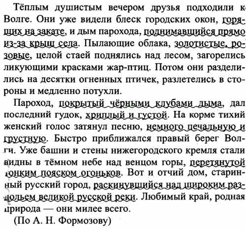 Тёпл..м душист..м вечером друзья подходили к Волге. Они уже видели блеск городских окон горящих на закате и дым парохода подымавшийся прямо из (за) крыш села. Пылающие облака золотистые розовые целой стаей поднялись над лесом заг..релись ликующими красками (жар) птиц. Потом они разделились на десятки огненных птичек разлетелись в стороны и медленно потухли.