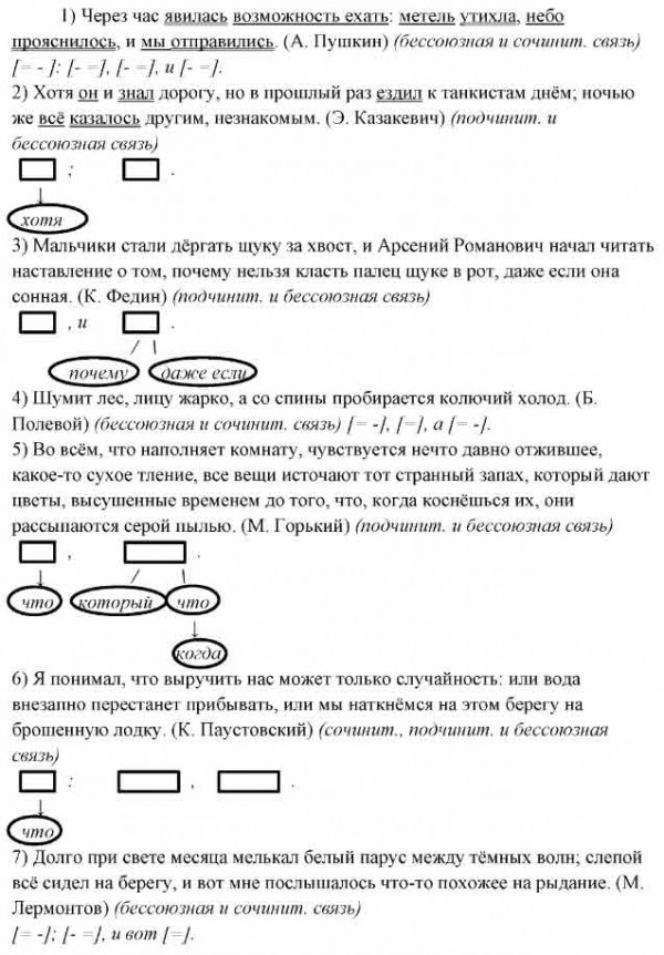 1) Через час явилась возможность ехать: метель утихла, небо прояснилось, и мы отправились. (А. Пуш кин) 2) Хотя он и знал дорогу, но в прошлый раз ездил к танкистам днём; ночью же всё казалось другим, незнакомым. (Э.Казакевич) 3) Мальчики стали дёргать щуку за хвост, и Арсений Романович начал читать наставление о том, почему нельзя класть палец щуке в рот, даже если она сонная. (К. Федин) 4) Шумит лес, лицу жарко, а со спины пробирается колючий холод. (Б. Полевой) 5) Во всём, что наполняет комнату, чувствуется нечто давно отжившее, какое-то сухое тление, все вещи источают тот странный запах, который дают цветы, высушенные временем до того, что, когда коснёшься их, они рассыпаются серой пылью. (М. Горький) 6) Я понимал, что выручить нас может только случайность: или вода внезапно перестанет прибывать, или мы наткнёмся на этом берегу на брошенную лодку. (К. Паустовский) 7) Долго при свете месяца мелькал белый парус между тёмных волн; слепой всё сидел на берегу, и вот мне послышалось что-то похожее на рыдание. (М. Лермонтов)